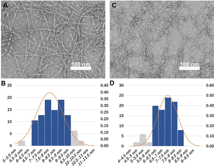 We used transmission electron microscopy (TEM) to characterize the nanostructures in solutions and hydrogels of the two compounds. From the TEM images, we observed nanofibers both in the solution and hydrogel. As shown in Fig. S13 (Supporting information), the solution of 1 showed nanosheets like morphology with an average diameter of around 12 nm. After the heating-cooling process, the nanostructures turned into dense and thin nanofibers with a diameter of around 6.5−9.5 nm (Figs. 2A and B), which indicating structural remodeling of molecules under temperature changes (the detailed statistical method of fiber diameter is shown in Supporting information). The diameter of nanofibers in the solution of 1P and hydrogel formed by 1P were almost the same, which were both around 6−8.5 nm (Figs. 2C and D, Fig. S13). However, the self-assembly increased the degree of cross-linking of the nanofibers, resulting in sol-to-gel phase transition.