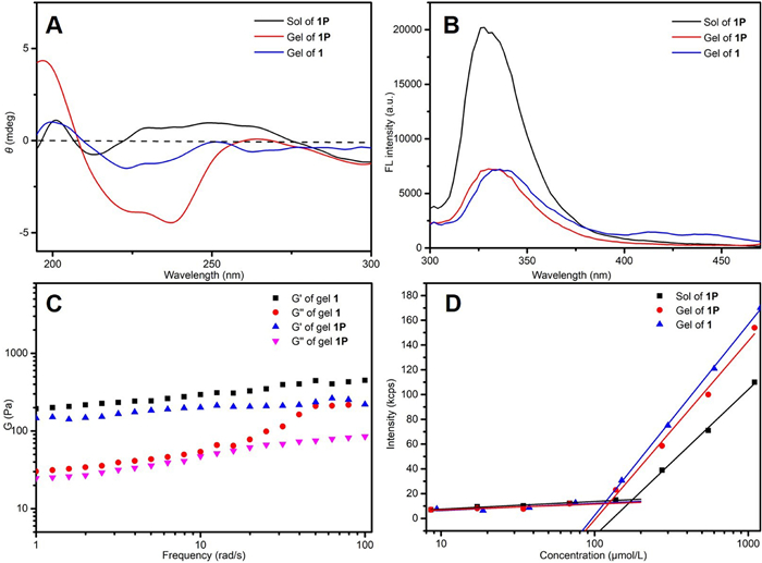 | Fig. 3. (A) CD spectra of the solution of 1P, the hydrogel of 1P formed by EISA at 37 ℃ and the hydrogel of 1 formed by heating-cooling process. (B) The florescence spectra of the hydrogels and the solutions (the concentration is 1 mmol/L). (C) Oscillatory rheology dynamic frequency scanning of the hydrogels of 1 and 1P. (D) The critical aggregation concentration (CAC) of the three compounds. | |