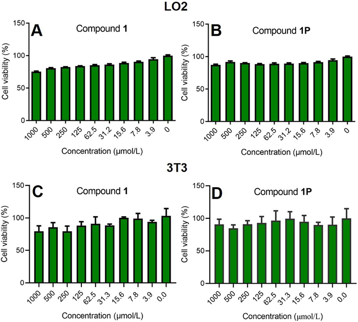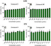 | Fig. 4. The cytocompatibility of compound 1 and 1P with liver cells (A, B) and mouse embryonic fibroblast cells (C, D). | |
