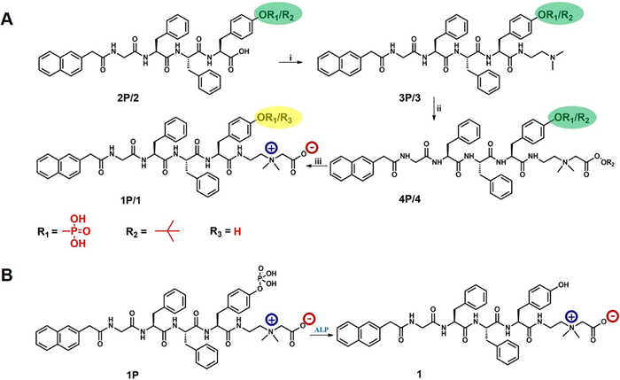 | Scheme 1. (A) Synthetic route of Nap-GFFY-CBPA (1) and Nap-GFFpY-CBPA (1P). (i) N, N-Dimethylethylenediamine, DIPEA, HBTU, DMF, r.t.; (ii) tert-butyl 2-iodoacetate, DIPEA, THF: DMF = 8:2; (iii) 95% TFA, 2.5% TIS, 2.5% H2O. (B) The EISA process of 1P to 1. | |