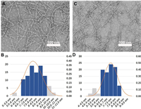 | Fig. 2. TEM images of the hydrogels of 1 (A) and 1P (C). Scale bars represent 100 nm. Frequency distribution histograms of the fiber diameter of compound 1 (B) and compound 1P hydrogels (D). | |