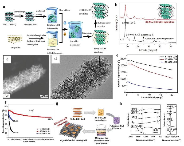 | Fig. 6. (a) Schematic of the synthetic process for Ni–Al LDH/rGO superlattice materials. (b) XRD patterns of Ni–Al LDH/rGO and Ni–Al LDH/GO superlattice structures. Reproduced with permission [85]. Copyright 2016, Elsevier. (c) SEM and (d) TEM images of 20NiAl-LDH. (e) Rate capabilities, (f) cycling performance of 5-, 10- and 20NiAl-LDH. Reproduced with permission [86]. Copyright 2017, Elsevier. (g) Schematic diagram for the preparation of C60–LDH nanocomposites. (h) FT-IR spectra. Reproduced with permission [88]. Copyright 2019, The Royal Society of Chemistry. | |