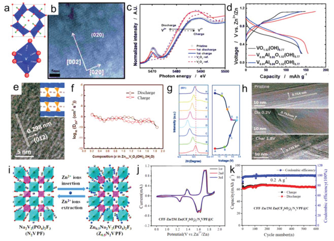 | Fig. 4. (a) The model structure, (b) HRTEM image and (c) K-edge XANES spectra of V1-xAlxO1.52(OH)0.77. (d) First discharge–charge curves of VO1.52(OH)0.77, V0.95Al0.05O1.52(OH)0.77 and V0.95Al0.05O1.52(OH)0.77. Copied with permission [72]. Copyright 2017, the Royal Society of Chemistry. (e) HRTEM image, (f) the corresponding Zn ions coefficients, (g) ex situ XRD patterns of Zn3V2O7(OH)2•2H2O. (h) HRTEM of the Zn3V2O7(OH)2•2H2O at initial, fully discharged (0.2 V) and charged (1.8 V) state. Copied with permission [73]. Copyright 2017, Wiley-VCH. (i) Zn storage mechanism illustrations, (j) CV curves and (k) initial three charge/discharge profiles of Na3V2(PO4)2F3. Copied with permission [80]. Copyright 2018, Elsevier. | |