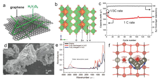 4. Oxygen vacancy in vanadium compoundV3O7 is a typical low-valent vanadium compound with oxygen vacancy. Kundu et al. [82] prepared layered V3O7•H2O that connected by hydrogen bonds, which was composed of VO6 octahedra and VO5 trigonal bipyramids. The hydrogen bonds strongly stabilized the structure compared with other vanadium compounds that were combined by Van der Waals force between layers. V3O7•H2O showed a high capacity of 400 mAh/g at 375 mA/g and small charge transfer resistance of 20 Ω, manifesting fast interface kinetics. Crystalline water is also crucial to the property of V3O7. Wang et al. [83] compared the properties between V3O7•H2O and V3O7. V3O7•H2O presented higher capacity, meaning that crystalline water maintained the layer structure for the (de)intercalation of Zn ions. Pang et al. [84] synthesized H2V3O8/graphene via a one step hydrothermal method (Fig. 5a). The vacancy sites between V–O octahedrons could accommodate the intercalation of Zn ions (Fig. 5b), leading to a high capacity of 394 mAh/g at 1 C rate (Fig. 5c). V6O13 with alternative single/double layers showed high capacity and good long-term cyclability [85]. Different from other previously reported Zn ions storage mechanisms, a highly reversible phase of Zn0.25V2O5•H2O appeared during discharging and disappeared during charging. The phase of Zn0.25V2O5•H2O not only stabilized the structure, but also produced more phase boundaries, resulting in more active sites, which was conducive to numerous Zn ions storage. Shin et al. [86] further studied the electrochemical mechanism of V6O13 nanosheeets/Zn system, the morphology was shown in Fig. 5d. They found that co-intercalated water could shield electrostatic interactions with the host matrix and enlarge the channel dimensions (Figs. 5e and f). The materials of V10O24•12H2O with bilayer structure showed high specific energy of 88.5 Wh/kg with a high power density of 12247.8 W/kg [87].