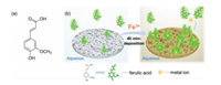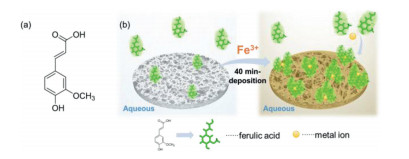 | Fig. 1. (a) Chemical structure of 3-(4-hydroxy-3-methoxyphenyl)-2-propenoic acid (FA) and (b) schematic illustration of the FA/Fe3+ deposition process. | |