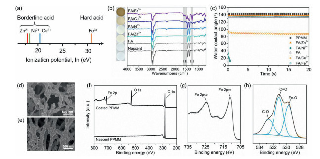 | Fig. 2. (a) Ionization potential of various transition metal ions used in this work [42]. (b) Digital photographs, ATR-FTIR spectra, and (c) dynamic water contact angles of nascent and modified PPMMs (deposition conditions: pH 5.0, FA/metal salt = 1:1, FA = 2.0 mg/mL, deposition time of 12 h). SEM images of (d) the nascent and (e) the FA/Fe3+-coated PPMM. XPS spectra of the FA/Fe3+-coated PPMM: (f) survey, (g) Fe 2p and (h) O 1s. | |
