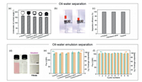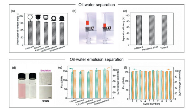 | Fig. 3. Performance of the coated PPMM in oil/water separation. (a) Underwater oil contact angles towards different oils. (b) Digital photographs of the separation setup incorporating the coated PPMM in the middle. (c) Separation efficiency of different oil/water mixtures. (d) Digital and optical photographs of the emulsion and filtrate. Scale bar: 50 µm. (e) Fluxes and separation efficiencies of different oil-in-water emulsions. (f) Long-term performance of the coated PPMM for petroleum ether-in-water emulsion separation. | |