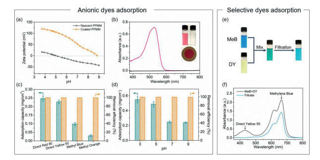 | Fig. 4. Performance of the FA/Fe3+-coated PPMM in anionic dyes adsorption. (a) Zeta potential of the nascent and coated PPMM at various pH values. (b) UV-vis spectra of the dye solution of direct red 80 and the corresponding filtrate. Insets: digital photographs of the feed and filtrate solutions, and the membrane after filtration. (c) Adsorption capacity and removal efficiency of the coated PPMM toward different dyes. (d) Adsorption capacity and removal efficiency of the coated PPMM toward direct red 80 solution of different pH values. (e) Digital photographs and (f) UV-vis spectra of MeB/DY mixture before and after filtration. | |