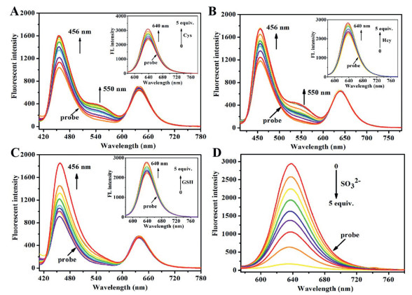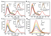 | Fig. 1. Fluorescence spectra of PI-CO-NBD (10 µmol/L) with (A) Cys (0-50 µmol/L), (B) Hcy (0-50 µmol/L), (C) GSH (0-50 µmol/L), (D) SO32− (0-50 µmol/L) in the PBS buffer (pH 7.4, containing 20% CH3CN, v/v). λex = 395 nm, Ex/Em slit: 5/2 nm. | |