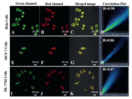 | Fig. 2. Intracellular localization of PI-CO-NBD in living MCF-7, HL-7702 and HeLa cells. (A, E, I) All the tested cells were prestained with MitoTracker Green FM (1 µmol/L), (λex = 488 nm and λem range: 498-651 nm). (B, F, J) All the tested cells were treated with PI-CO-NBD (10 µmol/L). λex = 565 nm and λem range 610-670 nm. (C, G, K) Merged images. (D, H, L) Intensity profiles of regions of interest. | |