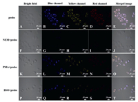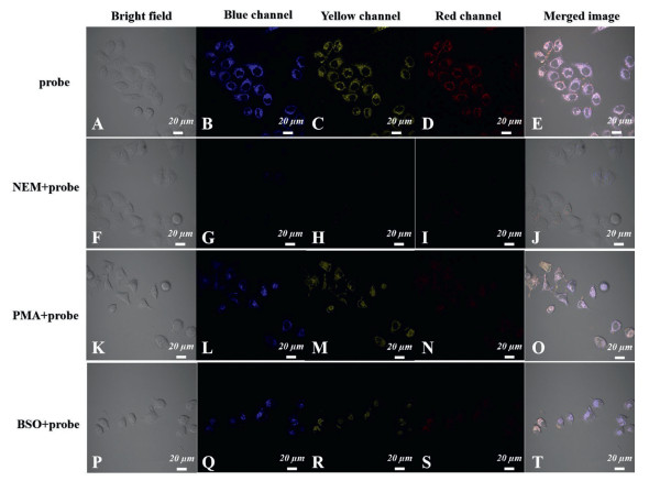 | Fig. 3. Fluorescence images of endogenous thiols in living HeLa cell. (A-E): Cells were treated with the PI-CO-NBD probe, (F-T): Cells were respectively pretreated with NEM (1 mmol/L), PMA (1 µg/mL), or BSO (100 µmol/L) for 30 min and then incubated with PI-CO-NBD (10 µmol/L) for 10 min. Blue channel: λex = 405 nm, λem = 450−510 nm; yellow channel: λex = 451 nm, λem = 520-580 nm; red channel: λex = 561 nm, λem = 610-670 nm. | |