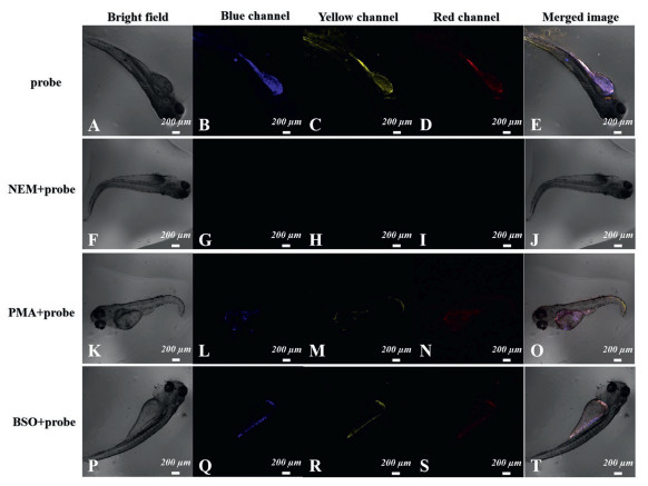 | Fig. 4. Fluorescence imaging of Cys/Hcy and GSH with three-channel in zebrafish: (A-E): Zebrafish were treated with the PI-CO-NBD probe; (F-T): Cells were respectively pretreated with NEM (1 mmol/L), PMA (1 µg/mL), or BSO (100 µmol/L) for 30 min and then incubated with PI-CO-NBD (10 µmol/L) for 10 min. Blue channel: λex = 405 nm, λem = 450-510 nm; yellow channel: λex = 451 nm, λem = 520-580 nm; red channel: λex = 561 nm, λem = 610-670 nm. | |