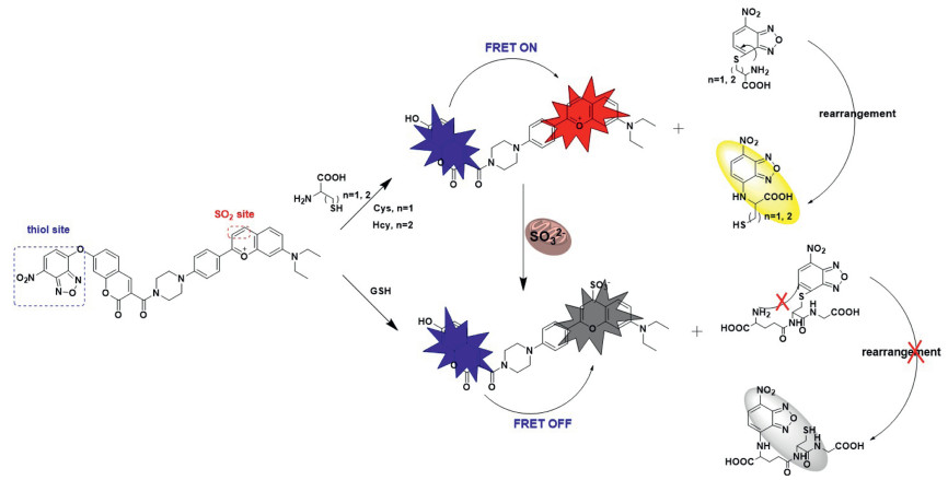 Reactive sulfur species (RSS) mainly includes three biological thiols, such as homocysteine (Hcy), cysteine (Cys), glutathione (GSH) and sulfur dioxide (SO2) [1-3]. This compound is ubiquitous in cells and even organisms, participates in the regulation of many physiological processes, and plays an extremely important role in maintaining the balance of life systems [4]. The concentration of active sulfur and abnormal metabolism are closely related to many diseases [5-9]. Pathological studies have shown that excessive sulfite/bisulfite can cause toxic reactions in cells and certain tissues [10, 11], and cause respiratory diseases [12], cardiovascular diseases and neurological diseases, etc. [13, 14]. Cys is the center of sulfur metabolism in cells, and its lack is related to skin diseases, liver damage, mental retardation and other diseases [15]. Hcy is an intermediate product produced during the production of Cys, and its unbalanced concentration level can cause diseases, such as neurological diseases, cardiovascular diseases, osteoporosis and enteritis [16, 17]. GSH is the most abundant thiol in cells [18-21], and GSH can maintain the redox activity in cells [22-25]. When the GSH concentration is not balanced, it can cause other diseases, such as Alzheimer's disease and lung disease [26-29]. Therefore, it is necessary to develop a new method for distinguishing detection. In recent years, a large number of literatures have reported fluorescent probes to detect one of the active sulfur [30]. However, most fluorescent probes are difficult to effectively distinguish Cys, Hcy, GSH and SO2, and the wavelengths of many probes are mainly concentrated in the short-wave region. Therefore, it is of great significance to develop functionally specific fluorescent probes for detecting biologically reactive sulfur species (RSS).