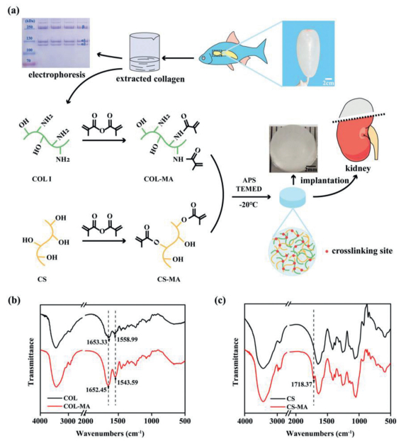 | Fig. 1. (a) Schematic illustration of constructing the biomimetic hydrogel scaffold for renal tissue regeneration and involved chemical structures and reactions. (b, c) Verifying the chemical structural information of different target compounds COL-MA (b) and CS-MA (c) with pure COL and CS as reference revealed by Fourier transform infrared spectroscopy (FTIR), respectively. | |