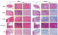 | Fig. 6. In vivo evaluation of renal tissue regeneration capabilities in partially nephrectomized rats by H&E and Masson staining at 8 weeks. The dotted lines represent the sites of surgical resection. The areas of implanted scaffolds in 2COL, 1COL/2CS, 2CS group and inflammation infiltration in injury group located above the dotted lines which were represented with yellow rectangle while native renal tissues located below the dotted lines were represented with blue rectangle. × 1, scale bars, 1 mm; × 20, scale bars, 50 µm. | |