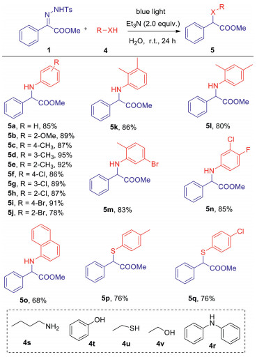 Based on the success of the light-mediated cyclopropenizations of N-tosylhydrazones in water, we further studied the applicability of this optimal condition to other carbene transfer reactions. First, we investigated the insertion reactions between N-tosylhydrazones and X-H bonds (Scheme 3). Primarily, we focused on testing N-tosylhydrazones and a variety of aromatic amines. The results showed that under the optimal conditions, both monosubstituted and disubstituted aromatic amines reacted smoothly with N-tosylhydrazones, and all the expected amino acid ester products were obtained in good to excellent yields (5a-5n). However, naphthalamine reacted with N-tosylhydrazons and afforded the desired product in 66% yield under these conditions (5o). Unfortunately, other aliphatic thiols, alcohols, phenols and amines did not provide the expected products. (4r-4v). Besides, we investigated the reaction of N-tosylhydrazons with monosubstituted aryl thiophenols, and the corresponding products were obtained with moderate yields (5p, 5q).