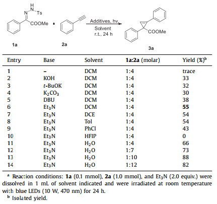 Initially, the blue-light-mediated cyclopropenization of N-tosylhydrazone 1a (0.1 mmol) and phenylacetylene 2a (10 equiv.) was examined in dichloromethane (DCM) at 25 ℃ without the base. Unfortunately, no desired product was detected (Table 1, entry 1). Surprisingly, required methyl 1,2-diphenylcycloprop-2-ene-1-carboxylate (3a) was obtained in yields ranging from 30% to 55% when using KOH, t-BuOK, K2CO3, Et3N, and DBU as bases, and Et3N gave the best result (entries 2–6). After that, we further screened the solvent (entries 6–11), and the results showed that the reaction proceeded smoothly in water delivering the desired product in 66% isolated yield (entry 11). Besides, we investigated the equivalents of phenylacetylene and found that adding 10 equiv. of phenylacetylene significantly increased the yield of the target product (entry 13). Finally, through a detailed investigation of the amount of base and the reaction concentration, we have obtained the optimal reaction conditions.