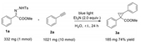 On the other hand, cyclopropenes, as strained carbocyclic compounds, are widely used synthons in organic synthesis due to their high reactivity [43, 44]. A particularly practical reaction to access cyclopropylenes is the cyclopropenization reaction of alkynes, for which a variety of expensive, precious metal catalysts, based on AuII, RhII, IrI, and AgI have been reported [45-48]. Also, a metal-free cyclopropenization reaction using tosylhydrazones has been reported, despite the shortcomings of low yields and elevated temperature [34, 40, 49-51]. In the context of the development of environmentally benign methods for the synthesis of cyclopropylenes and our previous work, herein we developed a blue light-induced cyclopropenization reaction of N-tosylhydrazones with alkynes (Scheme 1c). Notably, this is the first report on light-induced metal-free cyclopropenizations of N-tosylhydrazones in water.