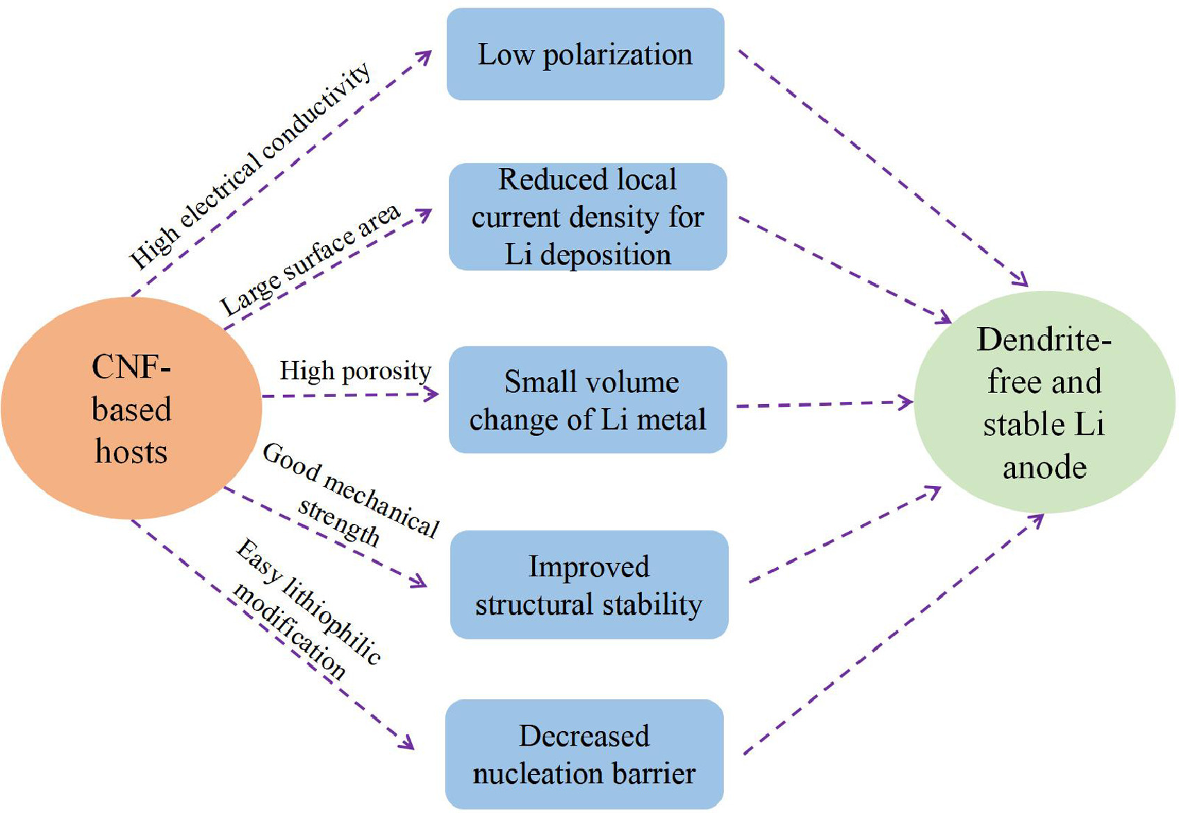 | Fig. 8. Schematic illustration showing the benefits of CNF-based hosts for Li metal anodes. | |