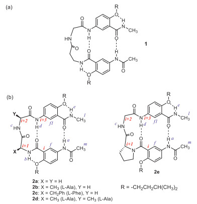 | Fig. 1. (a) Hybrid peptide 1 shown as its expanded β-turn conformation. (b) Hybrid peptides 2a-2e shown as their likely β-turn conformations. The amino acid residues are labeled in red. The selected hydrogens are labeled in blue. | |