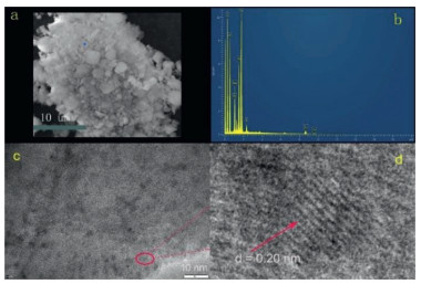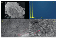 | Fig. 1. SEM image (a), EDS pattern (b) and TEM images (c, d) of TPT-Zn@MS. | |