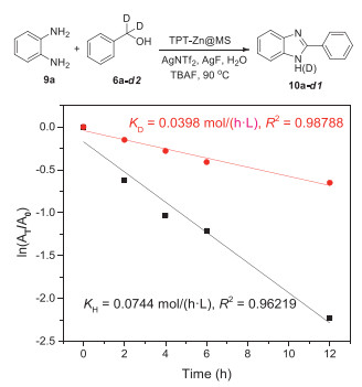 Hammett plot equation was investigated and the results were concluded in Supporting information Meanwhile, to clearly explain this reaction, kinetic isotope effect vale (KIE) was studied to explore the kinetically relevant elementary steps and the experiments revealed that KIE value (1.86) was achieved through the first order reaction plot between ln[6a] and ln[6a-d2] (Fig. 3). This disclosed that the rate-determining step is the dehydrogenation of alcohol (6a) in the synthesis of 2-aryl-1H-benzo[d]imidazole derivatives.