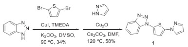 Recently, our group developed several triazole-skeleton ligand bridged transition-metal complexes, which showed good catalytic activities in dehydrogenation and borrowing hydrogen reactions [11-16]. However, most of the central metals are noble metals, low catalyst stability or catalysts are difficult to be recovered and reused [17-19]. Herein, we have described the synthesis of an unsymmetrical thienyl-pyrazoly-triazole ligand (TPT) and the corresponding heterogeneous zinc composite on molecular sieve (MS), which was carefully characterized by means of XPS, EDS, TEM and XRD (Scheme 1). The resulting zinc composite revealed good catalytic activity for borrowing hydrogen reaction of amines with amines in water under base-free conditions. Moreover, 2-aryl-1H-benzo[d]imidazole derivatives were synthesized with this zinc composite in water under base-free conditions.