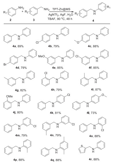 | Scheme 3. Reaction of aromatic aimines and benzylamines. Reagents and conditions: 2 (1.0 mmol), 3 (1.2 mmol), TPT-Zn@MS (10 mg), AgNTf2 (0.3 mmol), KF (0.3 mmol), TBAF (0.3 mmol), water (3.5 mL), 90 ℃, 48 h, N2. Isolated yields. | |