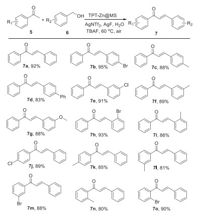Encouraged by such wonderful results, we further employed TPT-Zn@MS to ketones and various benzyl alcohols. After optimizing the condition of the reaction of ketones and various benzyl alcohols, it was demonstrated that the C-C bond formation could be smoothly transformed by this Zn composite, and then the substrate scope was explored and the results were summarized in Scheme 4. The experiments showed the products were obtained with good to excellent yields. It was noticed all combinations of ketones and benzyl alcohols provided high selectivity of the process on the formation of C=C bond. Under suitable conditions, both electron-rich and electron-deficient substrates could be reacted efficiently and the desired products were achieved with good yields (7b, 7e, 7h, 7k, 7l, 7n). The electron-rich benzyl alcohols bearing methyl, methoxyl groups afforded the products in high yields (7c, 7d, 7f, 7g, 7i). The electron-efficient ketones bearing chloro, bromo groups were also suitable to this transformation in good yields (7j, 7m, 7o).