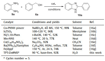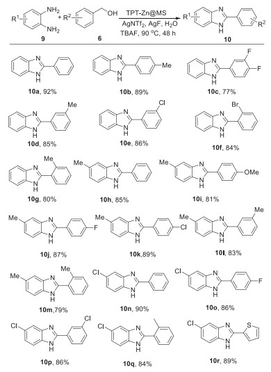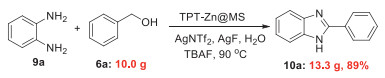Finally, the gram-scale synthesis of 2-aryl-1H-benzo[d]imidazole from the reaction of phenylenediamine (5a) and benzyl alcohol (2a) was carried out. As expected, the result showed that the desired product (10a) was achieved smoothly in 89% yield (Scheme 9). This gram scale experiment disclosed that TPT-Zn@MS system could promote the synthesis 2-aryl-1H-benzo[d]imidazole derivatives under base-free conditions in water.