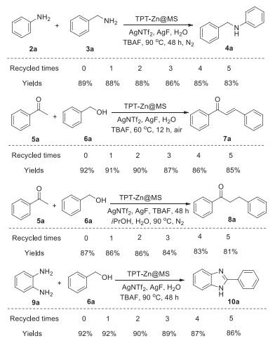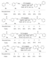 TPT-Zn@MS was finally recovered and washed with water (10 mL × 3), ethanol (10 mL × 3) and water (10 mL × 3). After drying for 24 h, the recovered TPT-Zn@MS was reused to catalyze all the above four transformations and the recycled experiments were concluded in Scheme 8. It was demonstrated that yields of the desired products could be nearly maintained until the composite was recovered for even five times. In addition, the extent experiment of TPT-Zn@MS revealed that no copper was detected through ICP analysis, which exclude the effect of copper catalysis. Meanwhile, the ICP assessment of recovered TPT-Zn@MS showed that silver was not found.