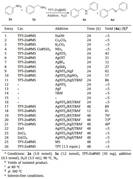 With above encouraging zinc composite in hand, the catalytic activity of TPT-Zn@MS was next investigated. Initially, the challenging reaction involving N-alkylation of amines and amines was selected to test the catalyst activity of TPT-Zn@MS, especially in water. Compared to classical N-alkylation conditions, such as, strong base, organic solvents, sealed flask, this reaction was attempted in water under base-free conditions. After a series of conditions screening, it was disclosed that the reaction could occur in water under base-free conditions. For a higher yield, the additive experiments were carried out and the results showed that AgNTf2/KF could produce a much higher yield. The introduction of phase transfer catalyst could further enhance the yield of desired product (Table 1, entry 11). It was observed that the reaction of amine and amine could not take place in the absence of catalyst (Table 1, entry 16). It should be noted that the reaction could take place under solvent-free conditions, however, only moderate yield was achieved (entry 21).
