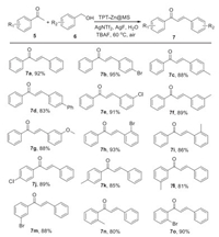 | Scheme 4. Selective synthesis of unsaturated carbonyl compounds. Conditions: 5 (1.0 mmol), 6 (1.2 mmol), TPT-Zn@MS (10 mg), AgNTf2 (0.3 mmol), KF (0.3 mmol), TBAF (0.3 mmol), water (3.5 mL), 60 ℃, air, 12 h. Isolated yields. | |