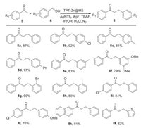 | Scheme 5. Selective synthesis of phenylpropiophenones. Conditions: 5 (1.0 mmol), 6 (1.2 mmol), TPT-Zn@MS (10 mg), AgNTf2 (0.3 mmol), KF (0.3 mmol), TBAF (0.3 mmol), iPrOH (3 mmol), water (3.5 mL), 90 ℃, N2, 48 h. Isolated yields. | |