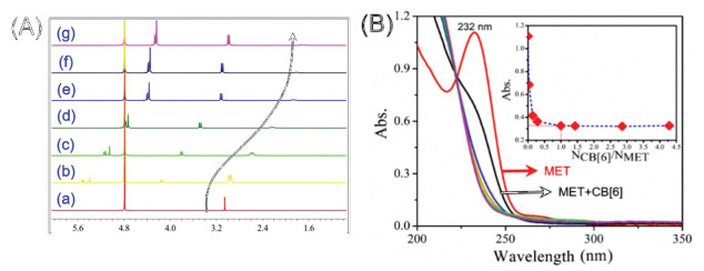 | Fig. 1. (A) 1H NMR titration spectrum of MET (4.0 mmol/L) and different content of CB[6] (a 0, b 0.25, c 0.5, d 0.75, e 1.0, f 1.5, g 2.0 equiv.); (B) UV–vis spectra of MET (70 µmol/L) and CB[6] (0-4.29 equiv.). Inset: The relationship between absorption intensity at 232 nm and NCB[6]/NMET. | |