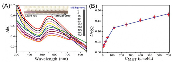 | Fig. 2. (A) UV–vis spectra of the CB[6]-modified AuNPs with the addition of MET at different concentrations; (B) Linear relationship curve between △A552 and the concentrations of MET. | |