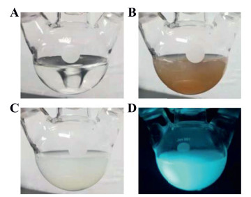 | Fig. 5. The photographs of (A) TA dissolved in alkali solution, (B) Fenton reagent added into (A), (C) the component in (B) added with phosphoric acid, and (D) the prepared Fe@TAOH under UV light. For interpretation of the references to color in this figure, the reader is referred to the web version of this article. | |