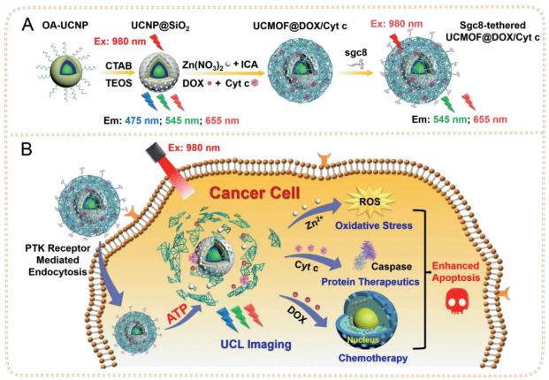 Herein, an aqueous-phase synthesis approach has been developed to fabricate UCMOFs for the cytosolic co-delivery of therapeutic protein and chemodrugs, achieving targeted combinational therapy of cervical cancer and real-time monitoring of drug release (Fig. 1). Due to the overlapping absorption of organic links 2-imidazolate carboxaldehyde (ICA) of ZIF-90 with UCL emission, the luminescence of UCNPs are effectively quenched by the MOF shell. In this study, a model protein drug Cyt c and small-molecule chemotherapeutic agent DOX are co-encapsulated in ZIF-90 shell via a de novo approach for combinational therapy. To endow the nanovehicles with targeting capability, the sgc8 aptamers are assembled on the surface of UCMOFs, which can specifically recognize the overexpressed protein tyrosine kinase 7 of cervical cancer cells [19]. After internalized into the target cells (e.g. HeLa cells) via receptor-mediated endocytosis, the UCMOFs are degraded by ATP in the cytosol [9], resulting in the restoration of UCL to monitor the release of the encapsulated drugs (Cyt c and DOX) and metal ions (Zn2+). Here, Cyt c can initiate the mitochondrial apoptosis pathway and result in the programmed cell death via caspase-mediated apoptosis [20], while DOX is able to induce the DNA fragmentation in nucleus and inhibit tumor growth [21]. In addition, the Zn2+-mediated generation of reactive oxygen species (ROS) can cause the oxidative damage to the cancer cells and further improve the therapeutic efficacy.