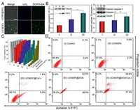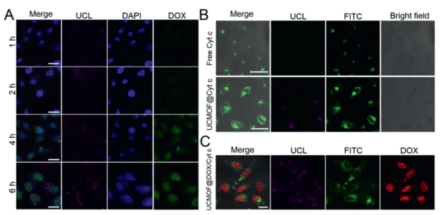 | Fig. 3. (A) CLSM images of HeLa cells incubated with sgc8-tethered UCMOF@DOX for different time durations. Scale bar: 25 µm. (B) CLSM images of HeLa cells incubated with free Cyt c and sgc8-tethered UCMOF@Cyt c (Cyt c labeled with FITC) for 6 h. Scale bar: 50 µm. (C) CLSM images of HeLa cells incubated with UCMOF@DOX/Cyt c for 6 h. Scale bar: 50 µm. | |