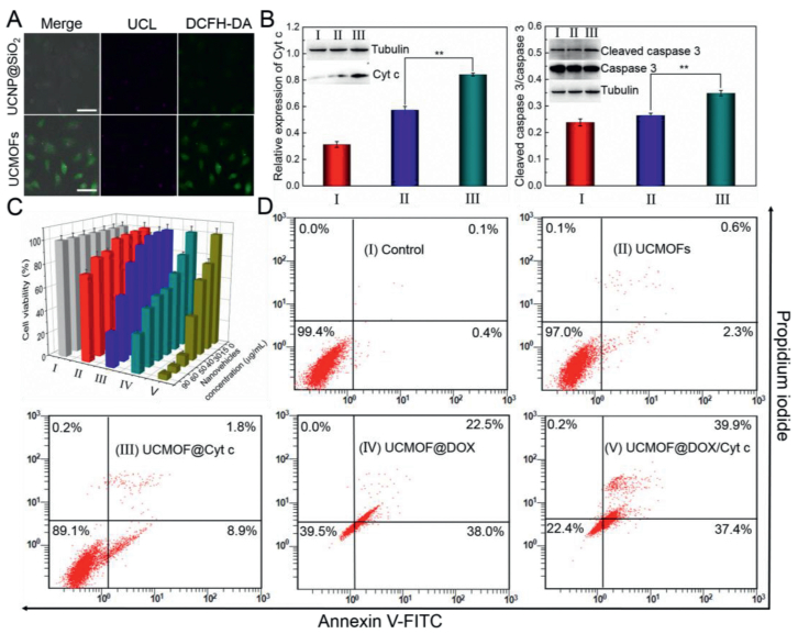 | Fig. 4. (A) CLSM images of ROS in HeLa cells treated with UCNP@SiO2 and UCMOFs, respectively. Scale bar: 50 µm. (B) Western blot analysis of expression of Cyt c and active caspase 3 in HeLa cells treated with (I) cell culture medium DMEM (control), (II) free Cyt c, and (III) sgc8-tethered UCMOF@Cyt c. ** P < 0.01 vs. free Cyt c (Two-tailed Student's t-test). Inset of B: Corresponding Western blotting images. (C) Cell viabilities and (D) flow cytometric analysis of HeLa cells treated with (I) cell culture medium DMEM (control), (II) sgc8-tethered UCMOFs, (III) sgc8-tethered UCMOF@Cyt c, (IV) sgc8-tethered UCMOF@DOX, and (V) sgc8-tethered UCMOF@DOX/Cyt c. Error bars represent the standard deviations from three independent measurements. | |
