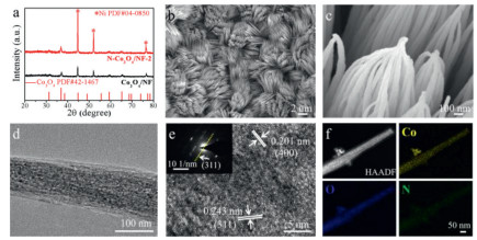 | Fig. 1. (a) XRD pattern of Co3O4/NF and N-Co3O4/NF-2 with the corresponding standard patterns of Co3O4 and Ni. (b, c) SEM images of N-Co3O4/NF-2 at different magnifications. (d) TEM and (e) HRTEM images of N-Co3O4, the inset of Fig. 1e is SAED pattern of N-Co3O4. (f) EDS elemental mapping images of N-Co3O4. | |