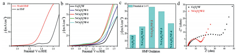 | Fig. 3. (a) LSV curves of N-Co3O4/NF-2 in 1.0 mol/L KOH with or without 50 mmol/L HMF. (b) LSV curves of Co3O4/NF and N-Co3O4/NF samples in 1.0 mol/L KOH with 50 mmol/L HMF. (c) Current density of Co3O4/NF and N-Co3O4/NF samples 1.4 V vs. RHE in 1.0 mol/L KOH with 50 mmol/L HMF. (d) Nyquist plots of Co3O4/NF and N-Co3O4/NF-2 in 1.0 mol/L KOH. | |