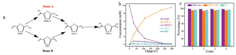 | Fig. 4. (a) Two possible pathways for HMF oxidation to FDCA. (b) Conversion rate and products yield of HMF oxidation with a N-Co3O4/NF-2 electrode in 1.0 mol/L KOH containing 10 mmol/L HMF at an applied potential of 1.423 V vs. RHE. (c) HMF conversion rate, FDCA yield and Faradaic efficiency (FE) for four cyclic tests. | |