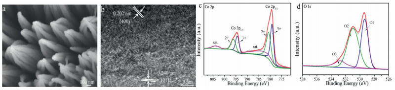 | Fig. 5. (a) SEM and (b) HRTEM images of N-Co3O4/NF-2 after four successive HMF electrolysis. XPS spectra of N-Co3O4/NF-2 in the (c) Co 2p and (d) O 1s regions. | |