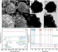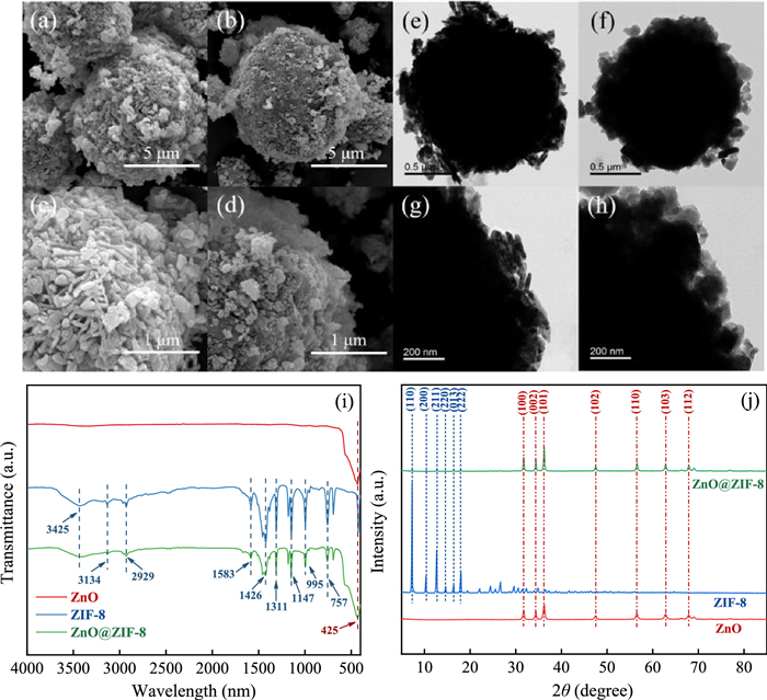 | Fig. 1. SEM images of (a, c) ZnO and (b, d) ZnO@ZIF-8. TEM images of (e, g) ZnO and (f, h) ZnO@ZIF-8. (i) FT-IR and (j) XRD spectra. | |