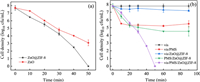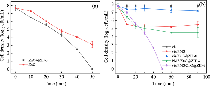 | Fig. 2. (a) Bacterial inactivation efficiency in vis/PMS/ZnO and vis/PMS/ZnO@ZIF-8 systems. (b) Bacterial inactivation efficiency in vis/PMS/ZnO@ZIF-8 system and control systems including vis, vis/PMS, vis/ZnO@ZIF-8 and PMS/ZnO@ZIF-8. Experimental conditions: T = 25 ℃; [Catalyst] = 100 mg/L; [PMS] = 0.05 mmol/L; pH0 = 6.5; λ ≥ 400 nm. | |