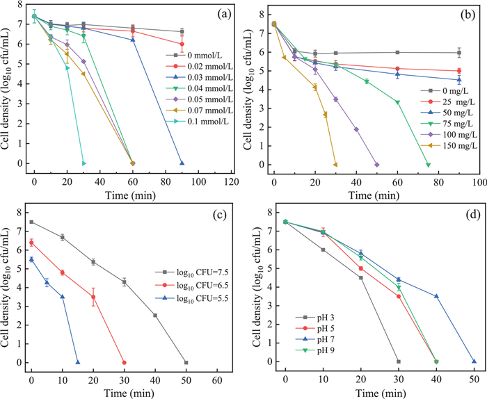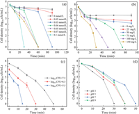 | Fig. 3. Effect of experimental conditions on bacterial inactivation efficiency in vis/PMS/ZnO@ZIF-8 system: (a) PMS concentration, (b) catalyst dosage, (c) initial concentration of E. coli, (d) initial pH. | |