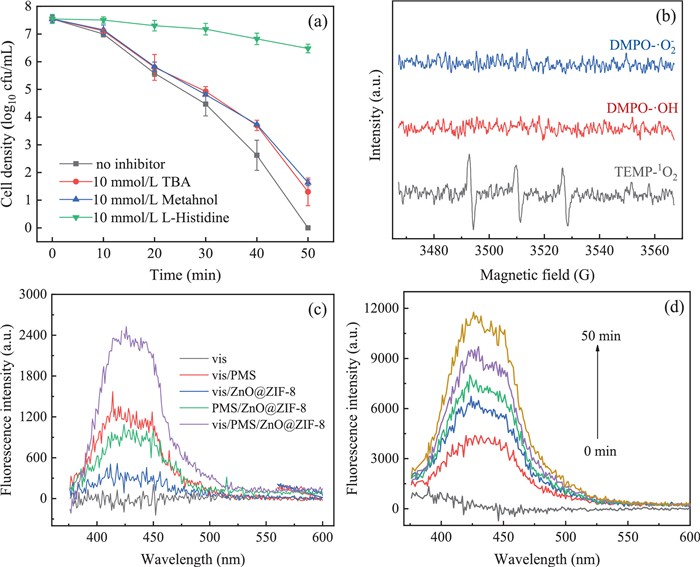 In order to find out the possible reactive oxygen species in the vis/PMS/ZnO@ZIF-8 system, specific inhibitors were used to trap potential reactive species. In detail, tert‑butanol (TBA), methanol and L-histidine were employed as inhibitors for •OH, •OH and SO4•−, and 1O2, respectively [33-35] First of all, E. coli activities in different inhibitor solutions were discussed. The control experiments showed that 10 mmol/L TBA, methanol or L-histidine barely affect the bacterial reproduction ability (Fig. S4 in Supporting information). As mentioned above, TBA is an efficient scavenger for •OH and methanol for •OH and SO4•−. It can be specific that there were almost no different inhibitions on bacterial inactivation efficiency between TBA and methanol, suggesting that SO4•− may not work in this case. But there still was a tender inhibition of TBA and methanol on bacteria inactivation, indicating that a small quantity of •OH existed in the system and acted on bacteria causing bacterial death. As Fig. 5a displays, the addition of l-histidine remarkably inhibited the cell inactivation efficiency, demonstrating that 1O2 was the main reactive oxygen species.