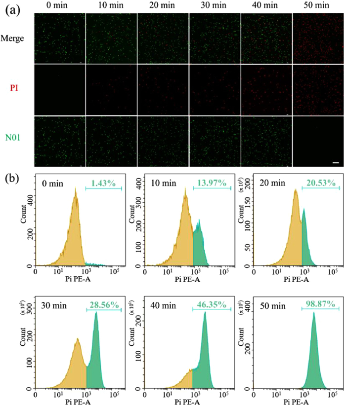 | Fig. 6. Bacterial fluorescent staining in vis/PMS/ZnO@ZIF-8 system: (a) analysis of laser confocal scan microscopy, the scale bar is 10 µm. (b) Flow cytometer analysis. Experimental conditions: T = 25 ℃; [ZnO@ZIF-8] = 100 mg/L; [PMS] = 0.05 mmol/L; pH0 = 6.5; λ ≥ 400 nm. | |