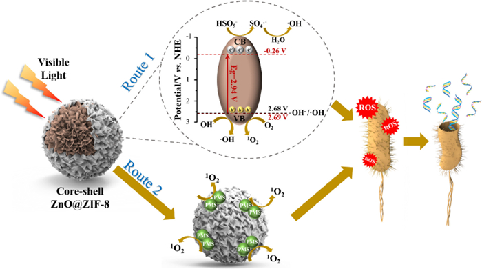 Unlike those conventional reagents, visible light generated from sunlight is nontoxic, inexpensive and endlessly renewable source of clean energy, which can be considered extremely environmentally friendly [10]. ZnO has become an alternative to TiO2 in photocatalytic reactions for its chemical and thermal stability, low cost and opto-electronic properties. It is an n-type semiconductor with a wide bandgap energy of 3.37 eV, but its low specific surface, rapid recombination of photo-generated electrons and holes limit its application. Fortunately, the photocatalytic performance of ZnO can be altered by modifying physical properties such as crystalline structure, morphology, or intrinsic defects as previous work reported [11-13]. ZIF-8 is a zeolitic imidazole-based metal-organic framework with large cavities interconnected by narrow windows, displaying good properties in adsorption, drug delivery and catalysis process [14], and it can be utilized to modify ZnO. In recent years, advanced oxidation processes (AOPs) based on persulfate (PS) and peroxymonosulfate (PMS) have gained importance as an alternative to traditional disinfection technologies [15-17]. However, there have been few reports on photocatalysis synergize with PMS in water sterilization.